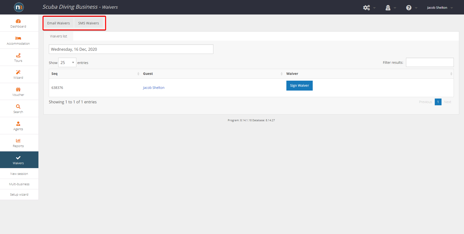 From this menu, you can view your guests’ waivers. Waivers can be signed and staff may accept or reject waivers from this menu.