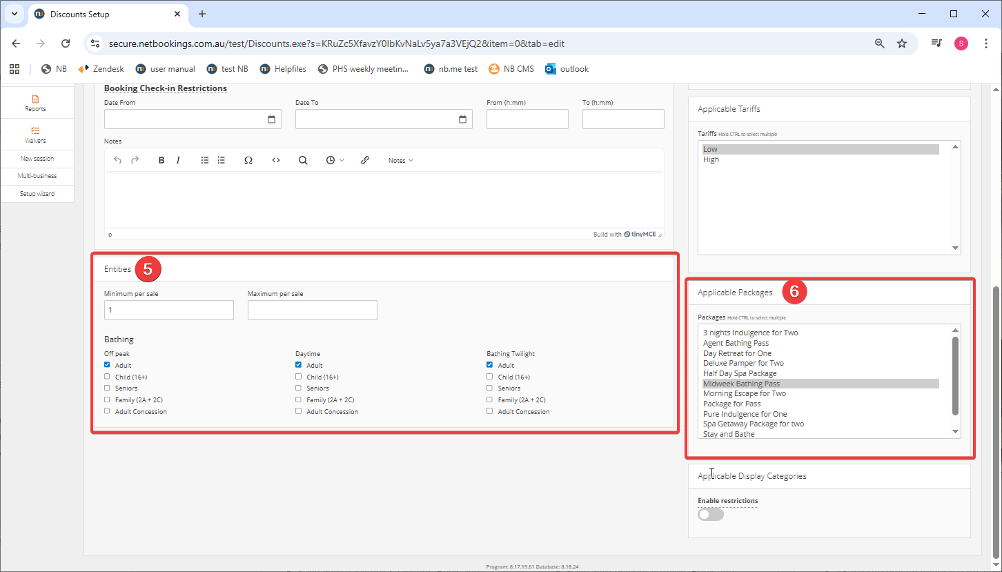 5. If you select a pricing from the ‘Available In’ menu, you will need to select what entities the discount applies to. Enter a minimum of ‘1’ for the discount to be valid. The maximum field allows you to restrict how many entities the discount can be applied to per booking. Eg. if you wanted a discount to only be available for two adults for a twilight bathing booking, both fields would be set to 2 and the ‘Adult’ box in ‘Bathing Twilight’ would be selected.