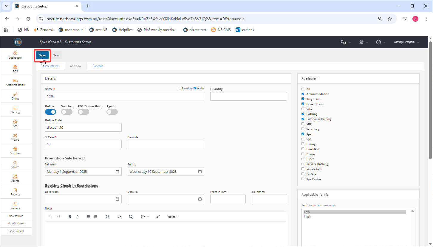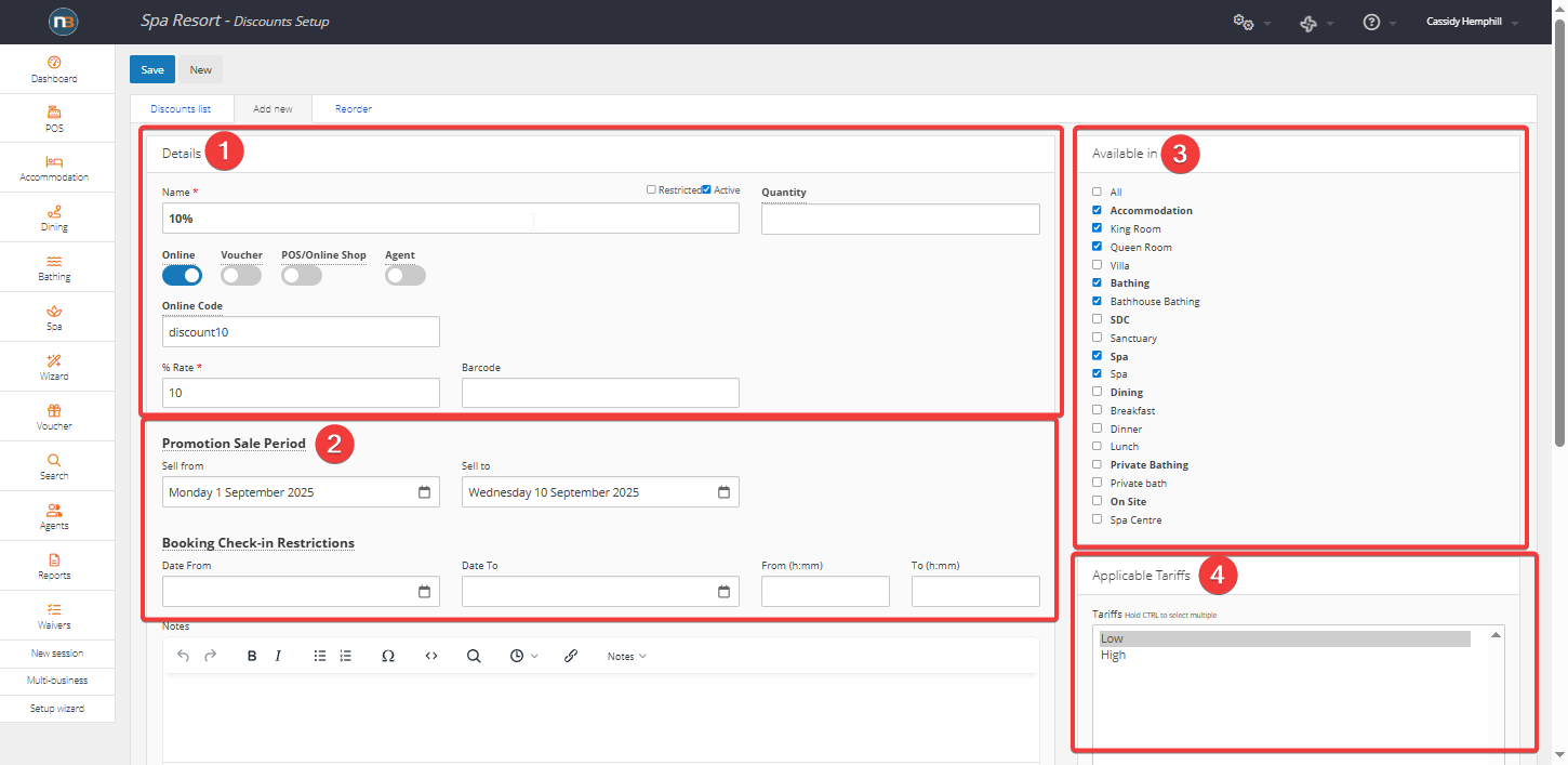 The name will be displayed in the cart when a guest applies it online and in the back-end for staff to see. To obtain the discount, the guest is required to enter the ‘Online Code’. In this case ‘discount10’.